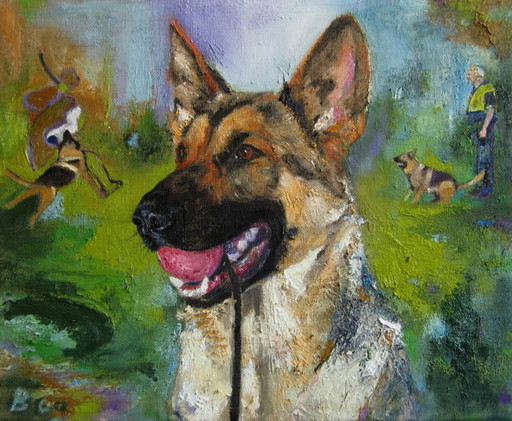 This portrait of Franzy, a deceased German Shephard, has a background in which scenes out of his sporting life appear.